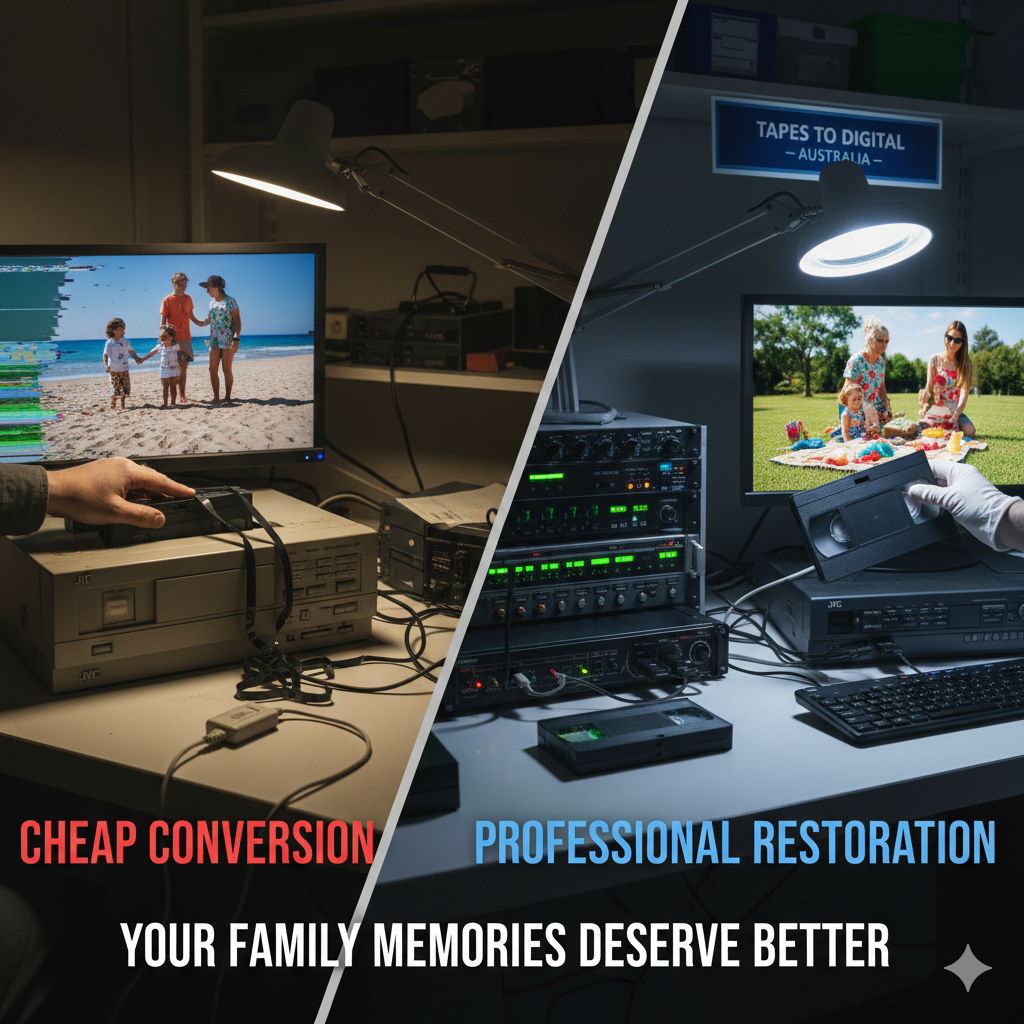 Old tapes are fragile. Magnetic tape can become brittle, or even develop mould if stored in humid Australian conditions. A cheap service might simply "shove the tape in" and press play. If a tape has a slight crease or a sticky layer, a poorly maintained VCR will snap it instantly.